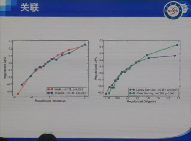这张图也是根据18960名学生数据的分析。右边这张很容易理解,学习的努力程度(用的是进出图书馆的数据来计算)和GPA是高度正相关的。一个有意思的发现是,生活的规律性也和GPA成正相关,也就是说生活越规律,学习成绩就越好。