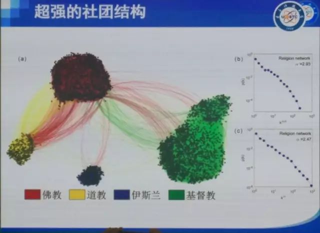 这是中国的宗教网络关系,不同的颜色代表了不同的宗教。人数最多的竟然是基督教,大概占一半左右;佛教占40%左右,其他道教和伊斯兰教大概占10%左右。我们看到,宗教与宗教之间也是有联系的(相互是粉丝),但是在这张宗教网络中有一个非常独特的一点就是,网络是非常highly, highly, highly,strong, strong, strong的内关联的。strong到什么程度呢?如果我们算Newman的Mixing Pattern强度,它是0.987。其他几百种社交网络的情况,包括民主党和共和党的关系、不同人种之间的关系,这些分离都比不上宗教。宗教对内非常凝聚,对外则很少连接,这些比民主党/共和党,比不同人种之间的分离还要严重。这是我们第一个比较大的发现,即宗教带来的隔离和分离,事实上是高于人种、高于肤色、高于政治信仰、高于国家的。