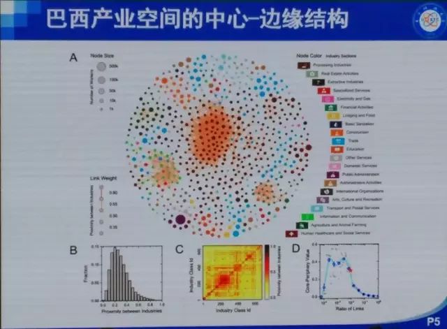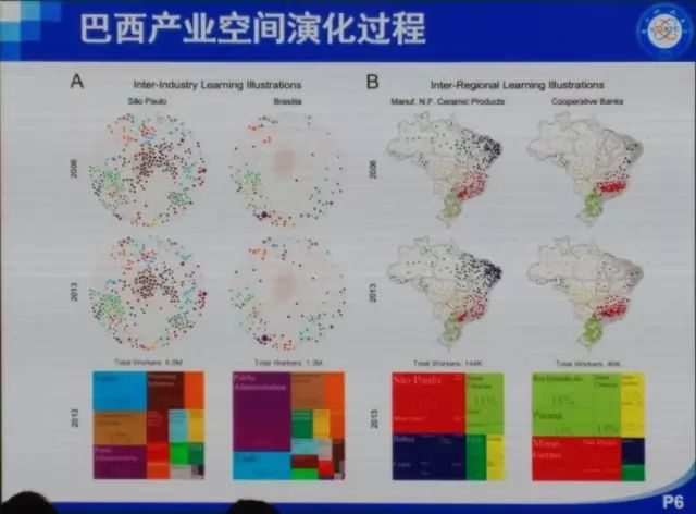 下面我们再来看一个关于巴西的例子。我们从网上爬到了8000多万条数据,简单来说就是,关于什么样的人会到什么样的行业去工作这样一个数据。巴西分了580多个行业(中国只分82个行业),图中每一个颜色都是一个产业分类,大概有20多个项,这些项细分为500多个行业,600多个工种。我们建一个图,每个节点都是一个600多维的vector,代表了劳工在这些工种中的分布。然后我们计算每两个vector之间的cos值,表示其相关程度。图中每个node的大小表示了这个工种上人数的比重。
