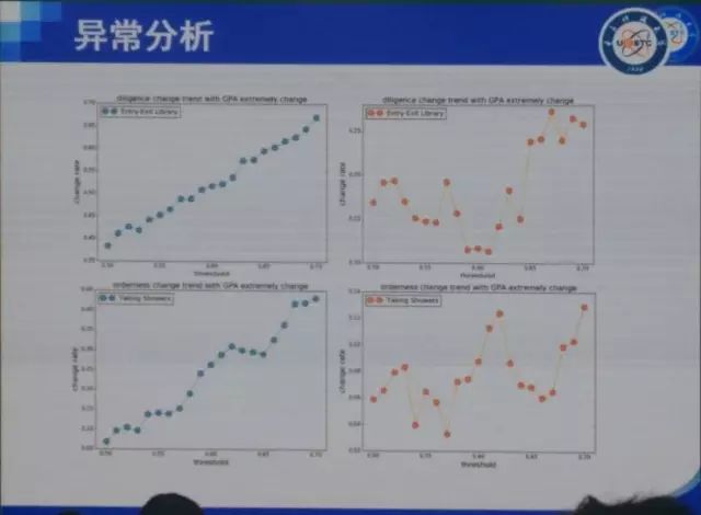 基于此,我们做了一个非常有意思的事情就是:异常分析。蓝色的是成绩下降,红色的是成绩上升。我们发现成绩下降与行为的关联是非常强的,而成绩上升则不一定。换句话说,逆袭不太容易,即使你做到了勤奋学习,成绩也不一定能有显著地提升。上升的我们管不了,但是我们可以通过你的异常行为来预测下次考试你的成绩是否会下滑。例如,你之前每月去30次图书馆,这个月就去了一次,那么肯定有问题。我们有20多个类似的异常分析。当然我们拿到的数据是匿名的,但是每个辅导员都知道大约100个学生匿名数据和学号的对应。如果出现了重大异常,例如连续多天没有刷卡记录,计算机就会自动给你的辅导员发一个通知,我们称之为失联预警。