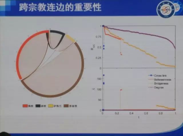 还有一个非常有意思的信息是,假设计算机是不知道连接之间是否是不同宗教,然后通过逐步去掉这些边来研究它们的重要性。我们发现如果按照“度”的方式来去掉这些边(事实上就是去掉宗教内部的连接),网络是没有相变的;而如果按照“bridgeness”的大小(bridgeness的大小表明了沟通不同区域之间的能力)逐渐去掉这些边,那么在不同的时候会出现两次相变;当按照“betweenness”的大小(简单说,这个指标衡量了一个节点作为媒介的能力,也就是占据在其他两个节点最短路径上最重要的节点,如果它拒绝沟通信息,那这两个节点就无法沟通,占据这样的位置越多,它的中介性就越大)依次去掉这些边,那么整个网络很快就崩溃了。同样,如果按“cross link”的大小(连接不同区域的能力)来依次去掉边,网络立马就崩溃。