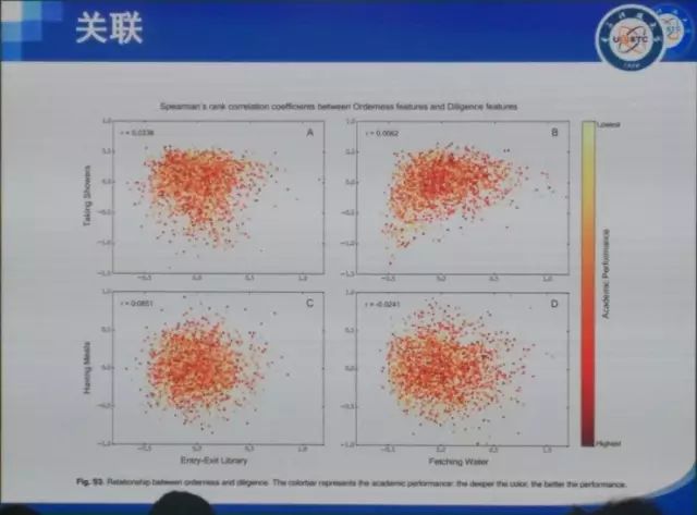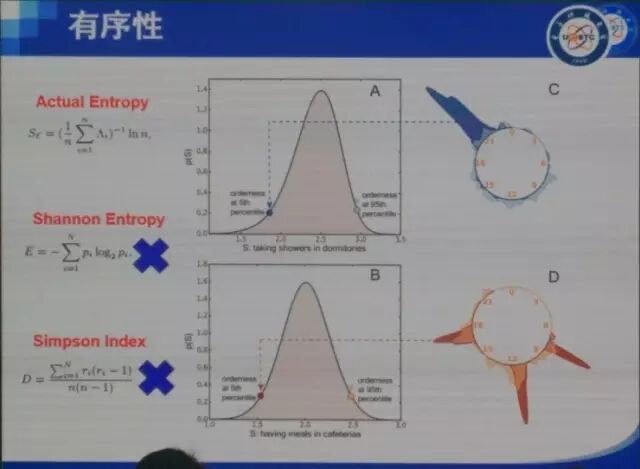 一个就是orderness,看你的生活是否有规律。我们用真实熵来衡量orderness。A图是18960名学生洗澡(时间)的数据。我们看到orderness排名前5%的学生(深蓝色),生活非常规律,基本上只在晚上9点洗澡;而后5%的学生(浅蓝色),则除了0-6点(澡堂不开门)外一天当中任何时候都可能去洗澡。B图中是吃饭情况,前5%(棕色)基本上都在三个饭点吃饭,而后5%(橘黄色)则基本上一天当中任何时候都可能去食堂刷卡,生活明显没有任何规律。