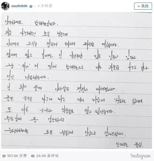 昨日发生的事情,相信很多粉丝们都无法接受吧!在今日下午,南太铉也透过自己的IG公开了手写信,感谢为他应援的粉丝们。