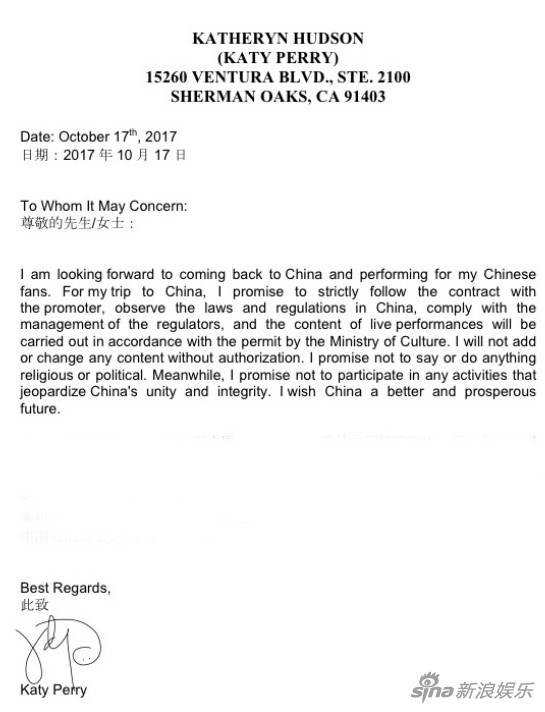 Chinese media are citing a seemingly leaked letter from Katy Perry to the Chinese government confirming that the “roar” singer will perform here in accordance with local laws and that she promises “not to participate in any activities that jeopardize China’s unity and integrity.”