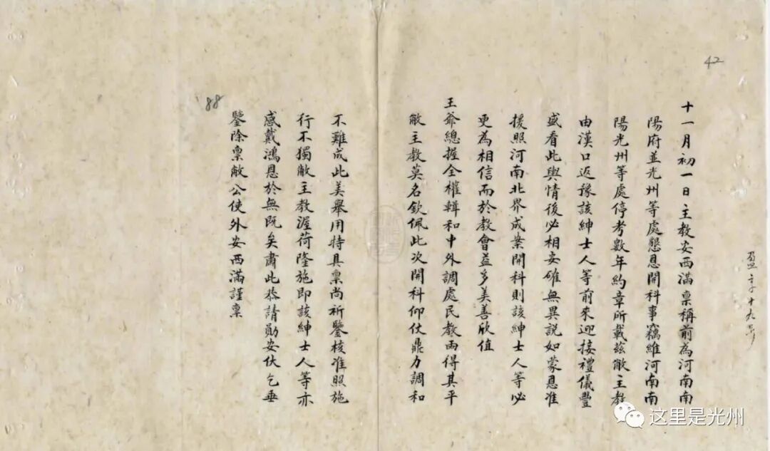自西牧去后,虽无土匪逼教凶耗,然信阳为南北通衢要道,加之是时楚军纷纷北调,铁路匆匆停工。而口说谣诼,难免蠢蠢思动之象。幸饶公保护甚力,即将教堂改贴保甲局字样。故信阳得无秋毫之患。(是时由山西逃至信阳西男女教士甚多憔悴可怜,饶公慰懃载,赠衣履,饕以佳食,并妥帖护送至汉口。)