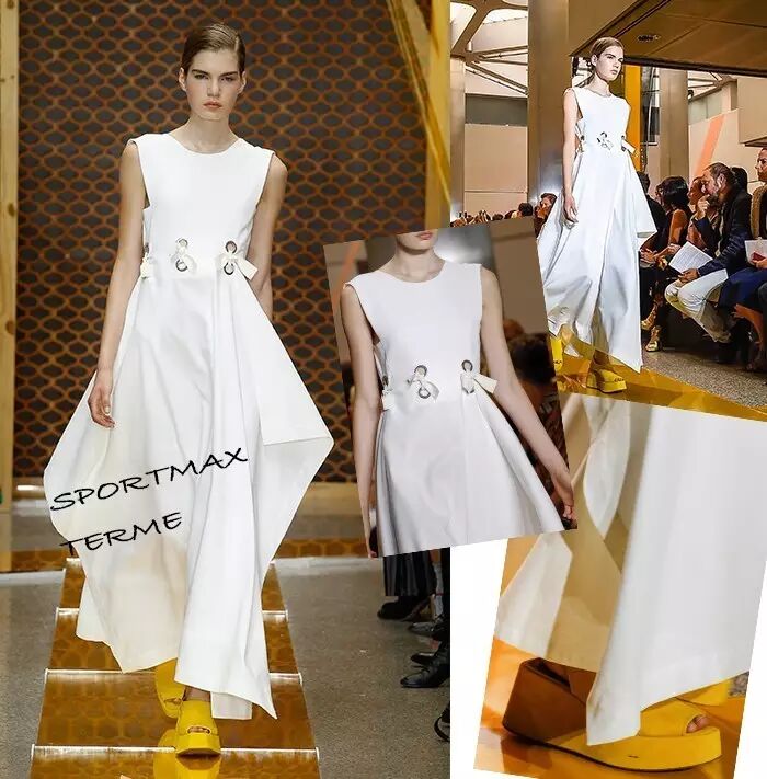 白色,是与浪漫有关的颜色。剪裁飘逸的手帕下摆,隐约性感的后片深V,甜美清新的蝴蝶结装饰,SPORTMAX 白色连衣裙,用极简的细节演绎少女情节。