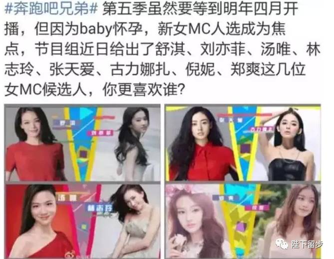 好不容易固定了两期之后,baby怀孕生子,跑男一直也没有录播。曾经几度传闻baby将被郑爽、宋茜、古力娜扎、鞠婧祎等女星代替。