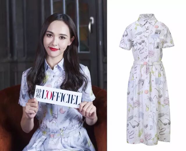 唐嫣穿的这件真丝连衣裙便是来自16春夏主打系列-“杜福尔回忆”。这些超萌的手绘图案由法国插画艺术家Pierre Le Tan根据对二十多年好友(ERDOS艺术总监杜福尔)的了解而创作。小清新的淡蓝信封,呆萌的鱼和萝卜,让少女风也充满了脱俗的雅致。