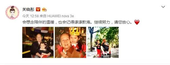今天清明节,关晓彤发博怀念自己的爷爷:“会想念陪伴的温暖,也会记得谆谆教诲。继续努力,请您放心”