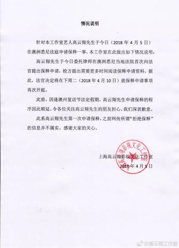 今天中午,高云翔的工作室在微博发声明,称之前网传高云翔被拒绝保释是假消息,他们是在今日庭审时首次向法官提出保释申请,4月10日将就保释申请事项再度开庭。由于遇到澳洲复活节法定假期的原因,高云翔的保释申请才就此顺延。