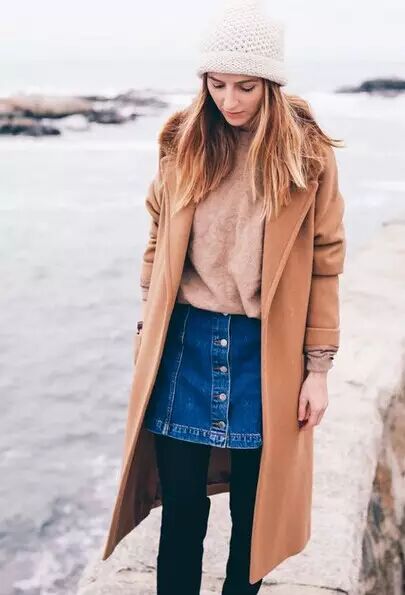 驼色大衣搭配同色系上衣搭配牛仔半裙~也是一双长靴,简单优雅~