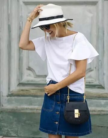 白色荷叶袖上衣搭配牛仔半裙,清新自然~