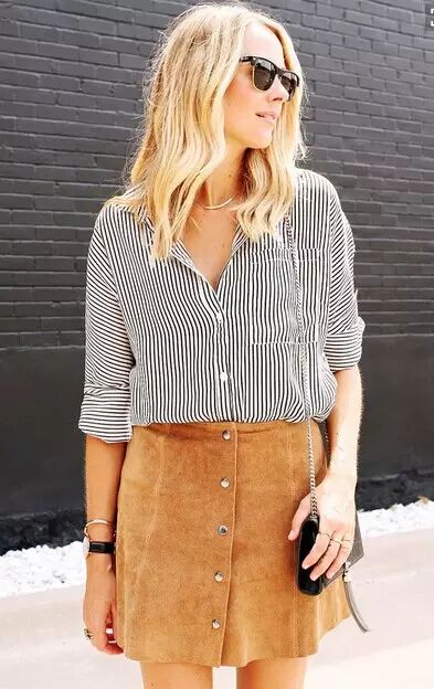 竖条纹的驼色上衣搭配半裙,简约的欧美范~