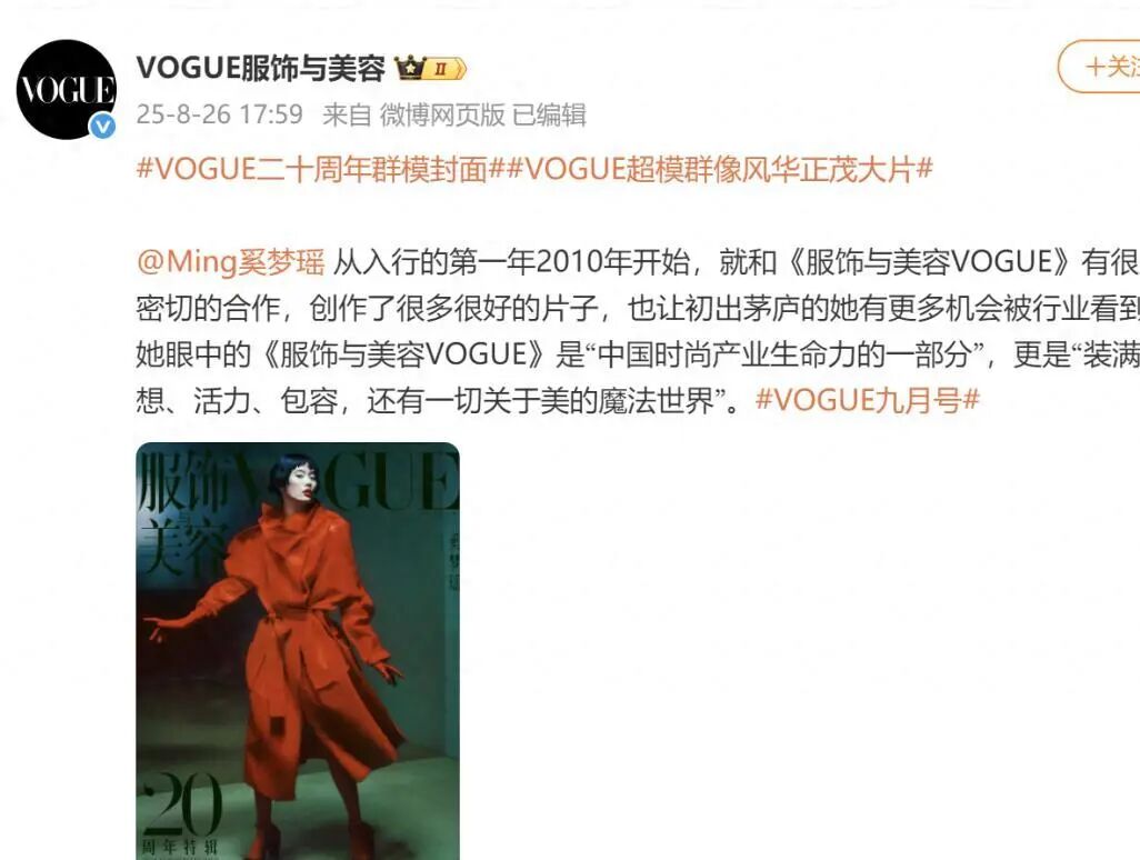 8月26日, 《VOGUE服饰与美容》二十周年群模封面发布, 奚梦瑤时隔13年零8个月再次登上这本杂志的封面. 网友们瞬间炸了锅:"恭喜奚妃回宫!"