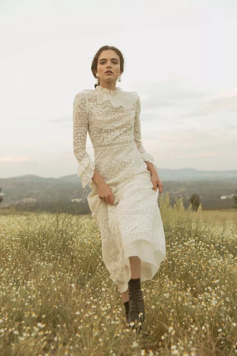 2018系列中的婚纱夹杂着些许的宗教禁欲感,设计师Cristina Savulescu选用最精致的蕾丝和手工刺绣、最创新的面料打造出了当代神秘复古的氛围。