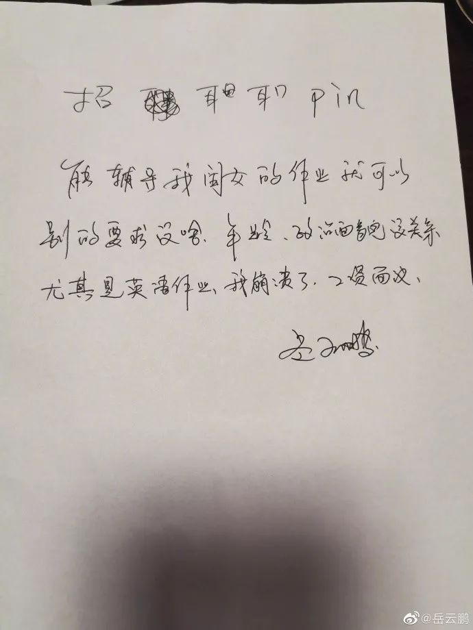 可能是心太急,岳云鹏把“招聘”的聘字连着写错了三次,最后索性换成了拼音,眼尖的网友还发现,“闺女”的闺字也写错了。