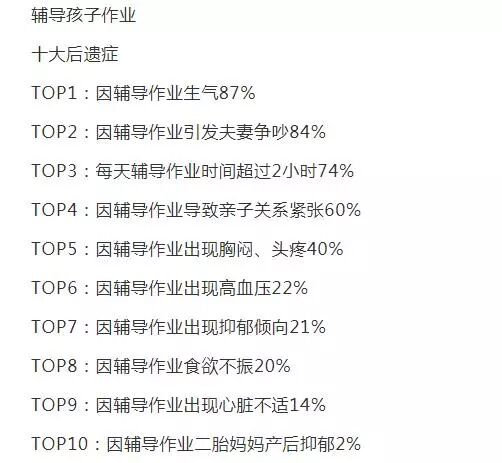 一则《2018年十大家长辅导作业“后遗症”》的报告显示,辅导小学生家庭作业的主力军是30-40岁的妈妈,而这些身负重任的家长们也因为焦虑产生了各种“后遗症”: