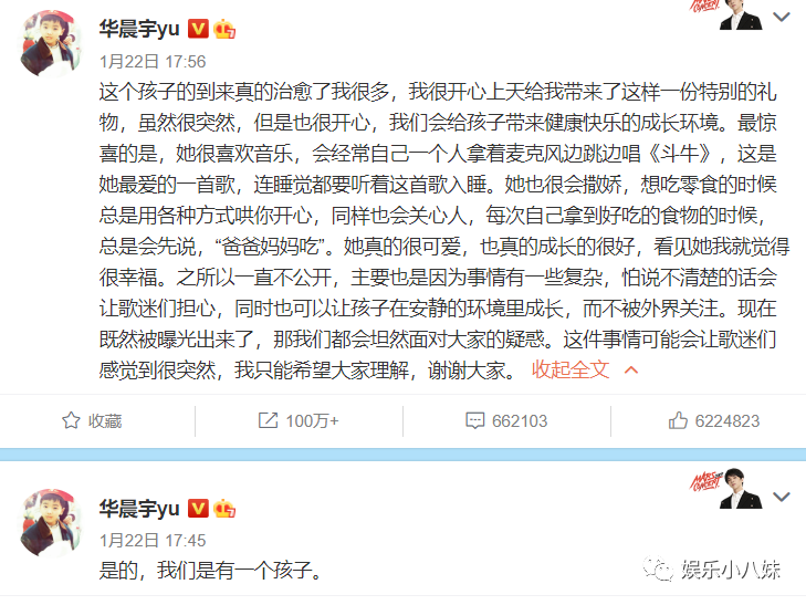 对于孩子一事华晨宇承认得非常坦荡,他表示自己和张碧晨是有一个孩子,并且这个孩子的到来治愈了他很多,他也非常开心上天给他带来了这样一份特别的礼物,他会给孩子带来健康快乐的成长环境,之前一直没有公开也是因为怕歌迷们担心,同时也希望孩子不要被外界过多的关注。