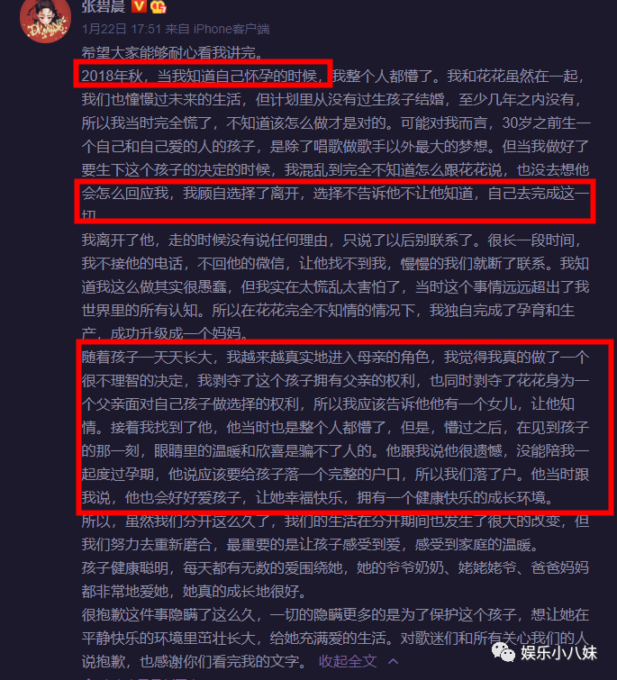 张碧晨的回应更绝,她表示自己是2018年秋天怀孕的,但是华晨宇并不知道这件事,张碧晨选择了独自离开孕育一个小孩,直到孩子长大了一些,张碧晨又觉得自己剥夺了孩子拥有父亲的权利,所以她最终告诉了华晨宇这件事,整篇文章都还是比较维护华晨宇的,看来张碧晨对花花还真是用情至深呀。