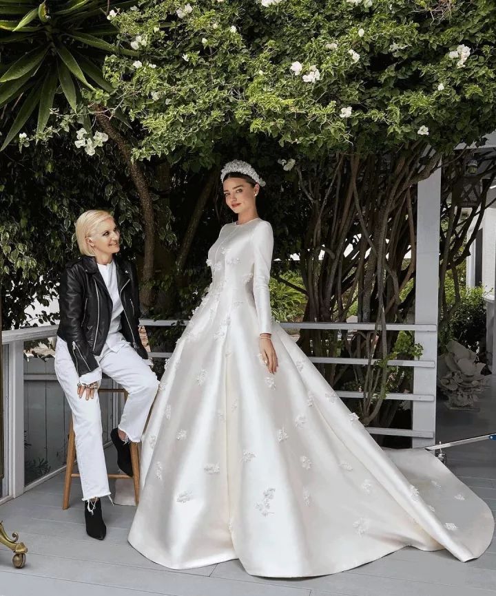 这件婚纱据说价格近100万,由Christian Dior的女装创意总监Maria Grazia Chiuri操刀设计,从预订到拿货历时3个月,以温柔绸缎搭配蕾丝镶边,简约优雅,很符合宋太太的气质。