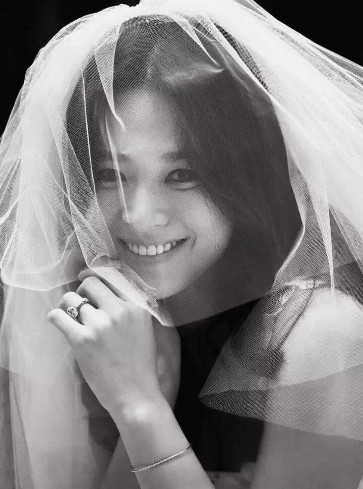 宋慧乔性情比较低调,婚纱简约,头纱也很轻巧,除了一堆耳环和手上的戒指,没有看到其他珠宝。