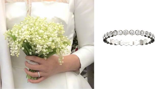 拿捧花的手上,乔妹戴的是CHAUMET家的Bee My Love全钻婚戒。