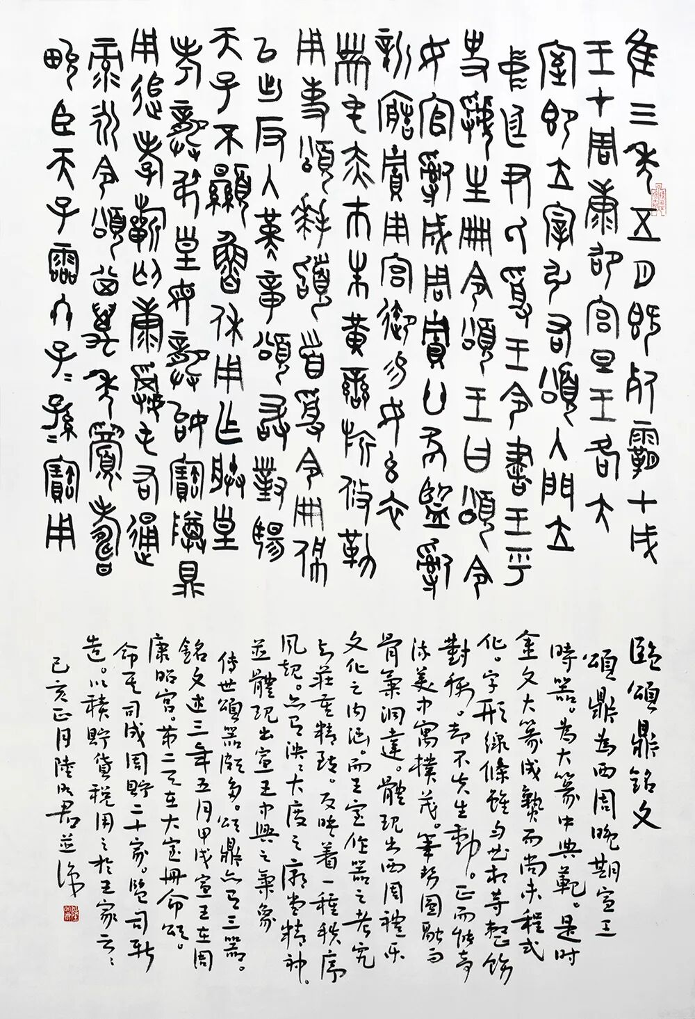 作为一名具有深厚文化背景的书家,陆明君对文字的演变、书法史与书法理论的通悉,使他的艺术求索的每一个阶段都保持着客观冷静和针对性。作为历史及书法文献方向的博士,他的学术研究除书法史论外,还涉及金石学、文字学、美术学等,他将文字研究的相关理论认识和成果转移到书法篆刻中来。品读陆明君的书法,最重要的感觉是作品古朴自然,而又不缺乏灵动。