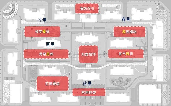 以大理春夏秋冬为光,打造了海川园、吟春园、荷月园、枫杏园、暗香园、童乐园、静逸园、撷芳园、紫晖园、凝翠园,十大主题公园,在整个社区,春赏樱夏赏荷,秋天有银杏和红枫的一树金黄,冬天白梅盛开,宛如一片片雪景,和苍山雪遥相呼应。