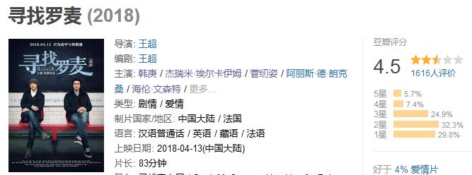 豆瓣评分挺平稳,第一天4·6,现在4·5,好于4%的爱情片。