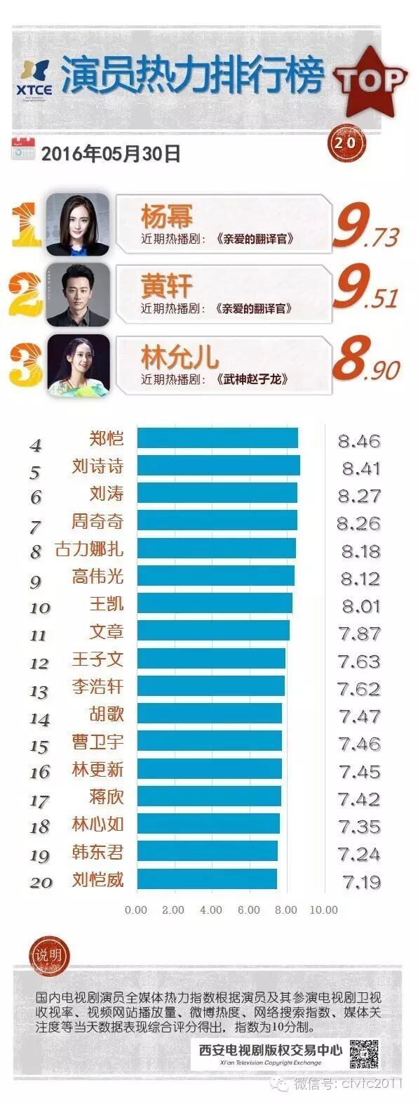 ★/西安电视剧版权交易中心影视数据评估中心通过监测国内电视剧演员及其参演电视剧卫视收视率、视频网站播放量、微博热度、搜索指数、媒体关注度等实时数据表现(每日00:00:00—23:59:59),运用综合评价算法计算评分,特推出“国内电视剧演员全媒体热力排行榜 TOP20”。/★