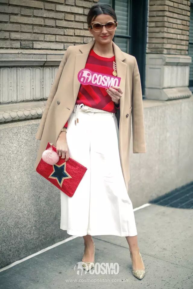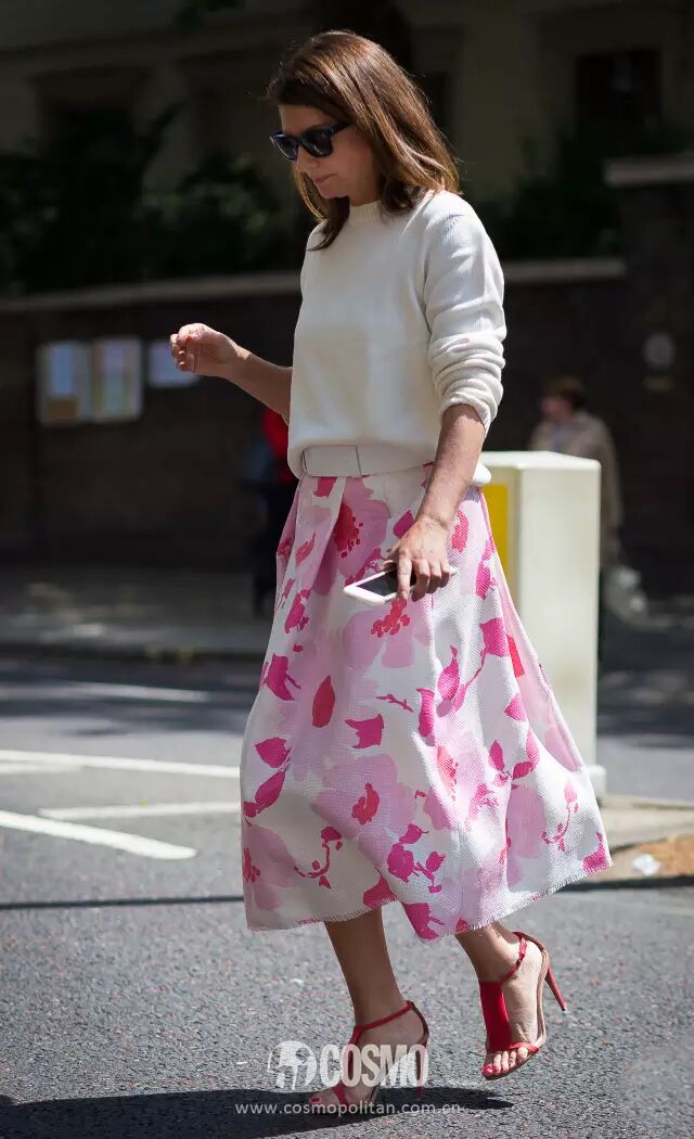 白色半身裙搭红色条纹拼接毛衫优雅又知性。