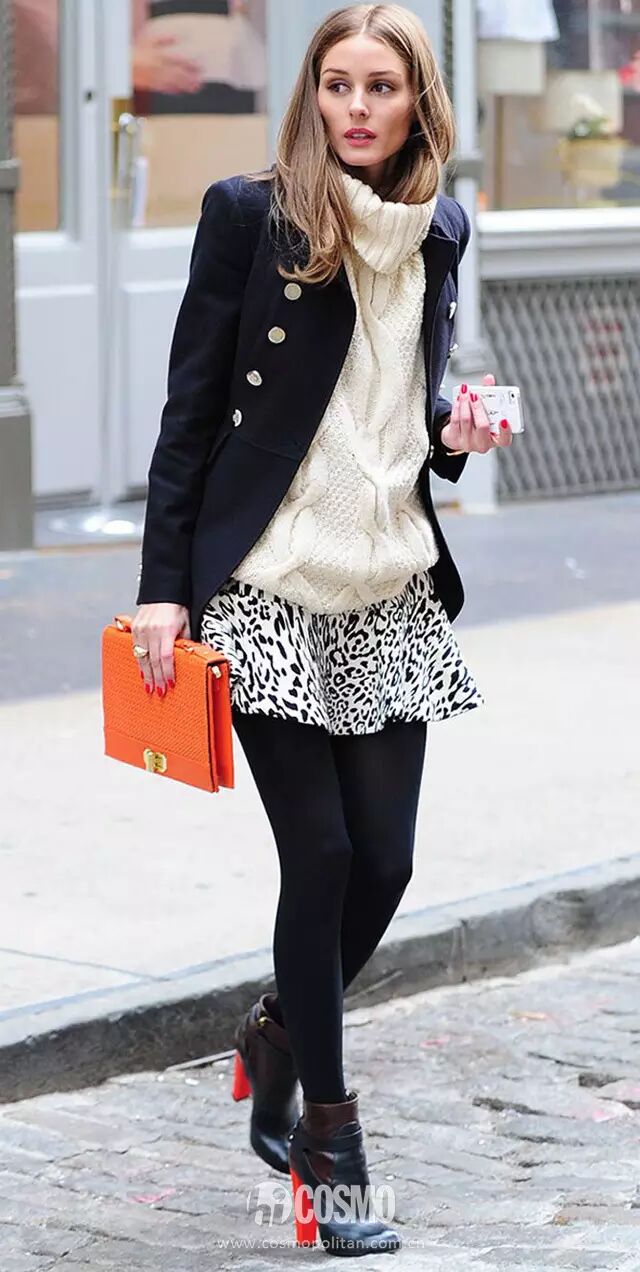 粗棒针织毛衣与豹纹款A字短裙look。