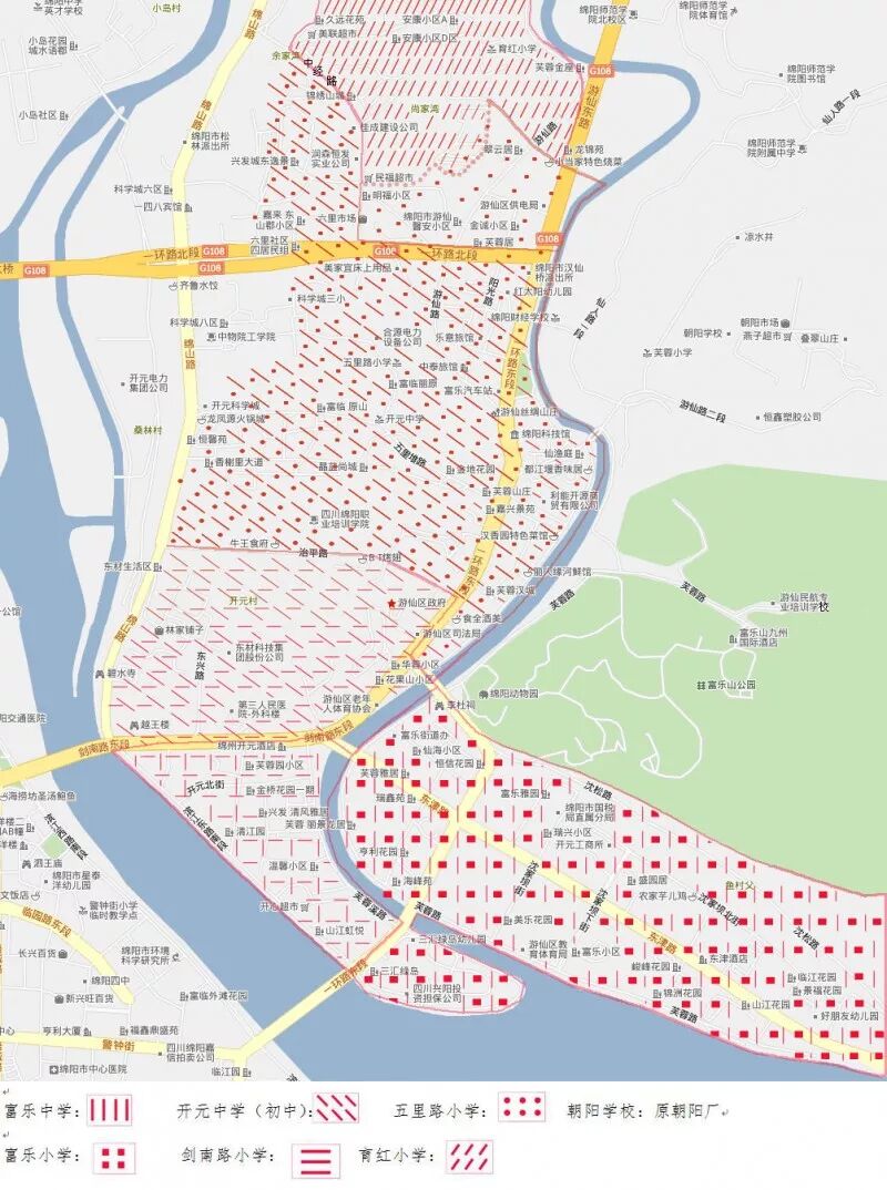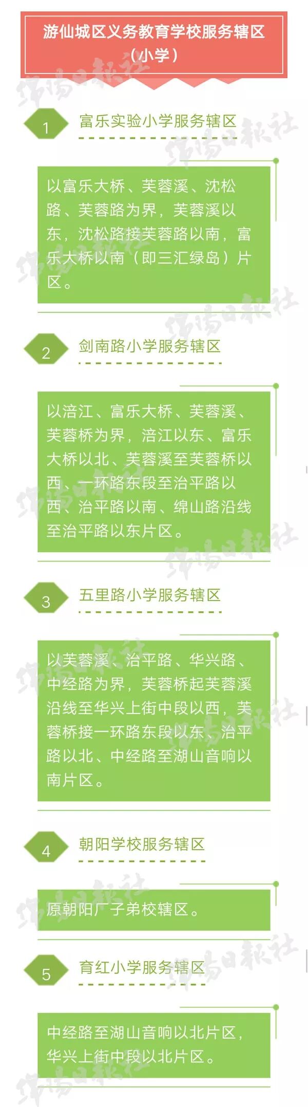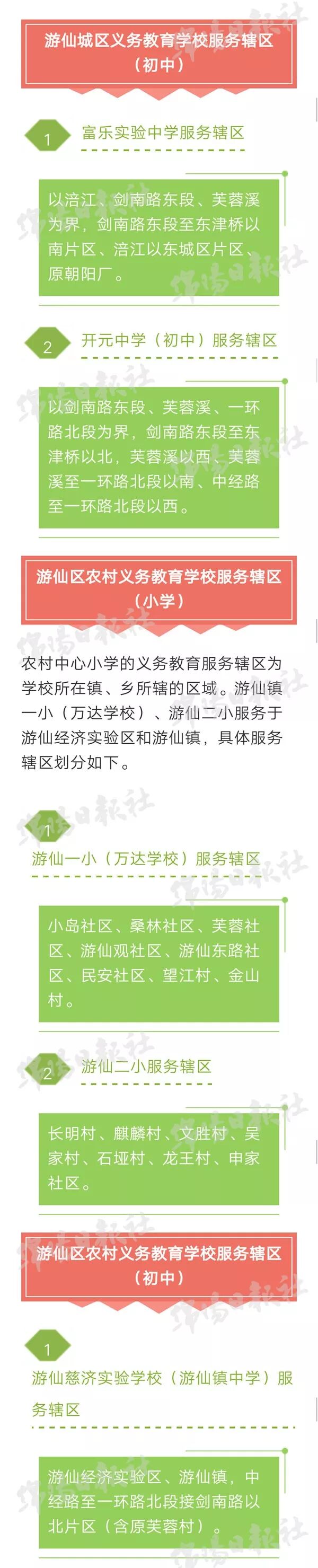 学区划分按照绵游教体发[2011]62号《关于调整划分义务教育学校服务辖区的通知》执行。学区划分情况可以在游仙区政务网(http://youxian.my.gov.cn/)上查询,也可以在就读学校的公示栏查询。