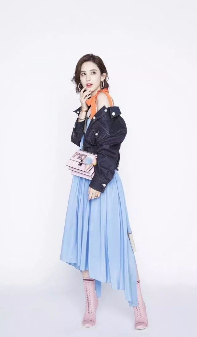 古力娜扎的这身搭配有没有一种时尚名模的感觉,上身穿着一件黑色的棒球服,下身穿着一件浅蓝色的不规则的过膝长裙,脚上穿着一双白色的一字高跟鞋,看上去十分的高贵。