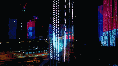 歌手张靓颖上演高空秀《我的梦》,与舞蹈演员升至70米的高空,以43座摩天大楼映射的灯光秀为背景,在玻璃幕墙上旋转跳跃真唱。
