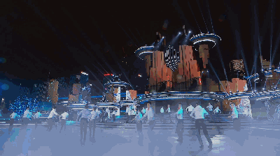 来自深圳龙华的深圳大漠大公司1300多架无人机——舞台球形无人机编队、室外千架灯光秀无人机编队、大规模撒花无人机编队一同登上舞台。