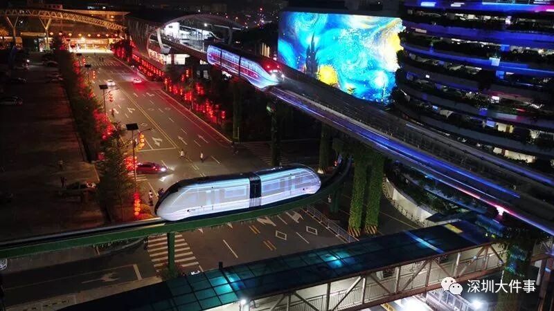 霓虹闪耀的城市,两条动感的空中列车交错驶出,未来感与科技感扑面而来——科幻电影大片中才有的“未来城市”图景,画面中在楼宇间自由穿梭的,其实是比亚迪自主研发的中小运量轨道交通产品,云轨和云巴。