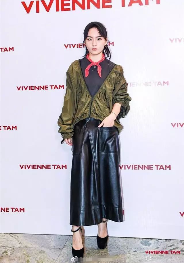 军绿色上衣设计元素时尚大气下搭半身皮裙,脚踩一双黑色高跟鞋,这样的周笔畅多了一丝丝女人味