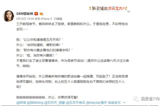 邓紫棋在微博上提到,母亲节那天,家人都出国旅行去了,家里就剩下她和外公,于是她决定带外公出去玩,一起去看五月天演唱会。
