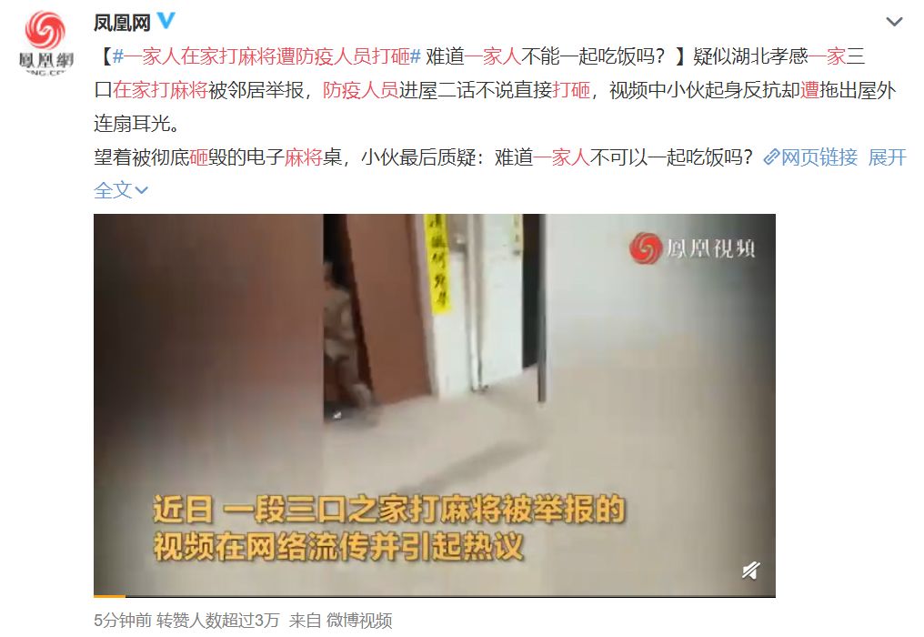 比如这两天的一条新闻:一家三口在家打麻将遭到防疫人员进门打砸。