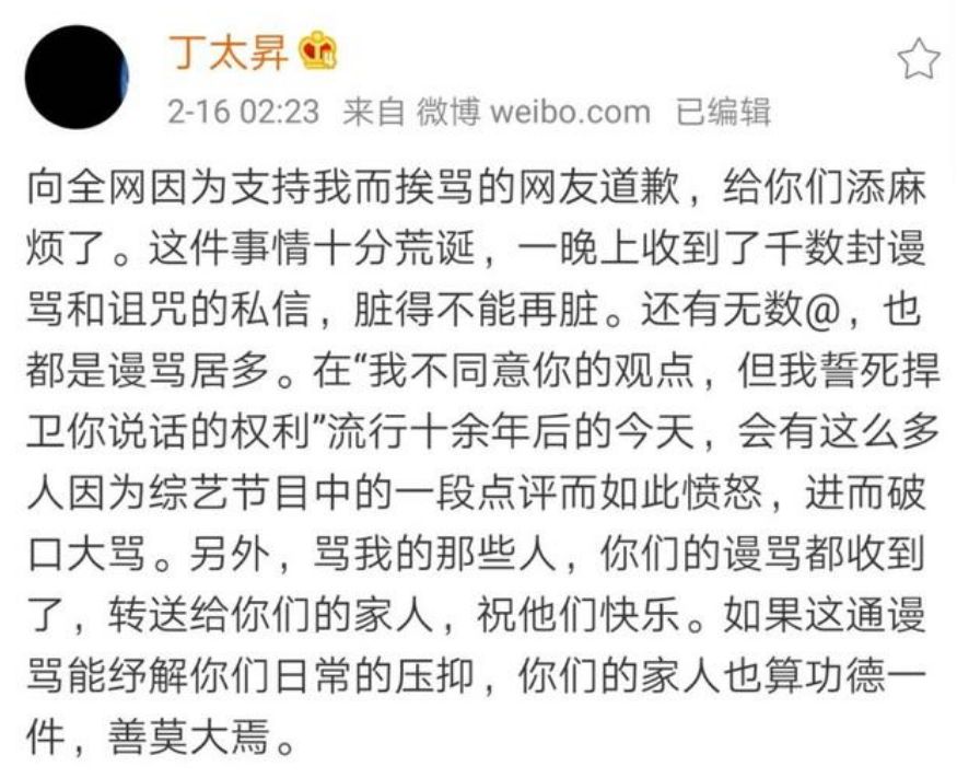 但在节目播出后的回应中,丁显然没有认识到自己行为的不合理之处,并把网友们对他的指责全盘化为“网络暴力”,把自己被骂的理由归结到自己的“少数”身份上,归结到“自己是为数不多敢讲真话的人”上面。