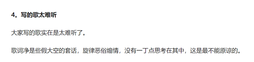 这些歌曲可能不会让大多数人喜欢,但值得所有人尊重。因此,与其站在高处对别人挑三拣四,不妨先掂量掂量自己的评价是否合理,自己的位置是否得当。