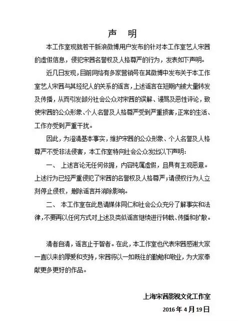 不过,今天中午,宋茜的工作室也发表了一个申明,声明只否认了宋茜与贾士凯绯闻,未提杨洋。