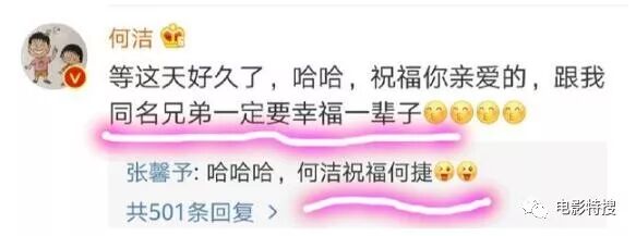 在众多的明星祝福中,何洁的祝福最有意思:跟我同名的兄弟一定要幸福一辈子。张馨予回复:哈哈哈,何洁祝福何捷。这一来一往主客双方,都有了点幽默细胞,绝对是一大串祝福名单里的亮点。也是碰巧啊,何洁竟然跟张馨予的新郎官撞名,同音不同字,汉字的博大精深又赢了。