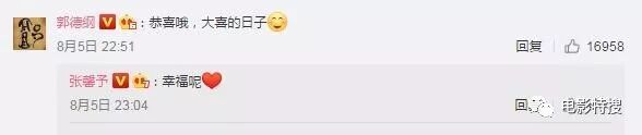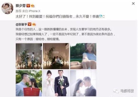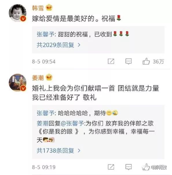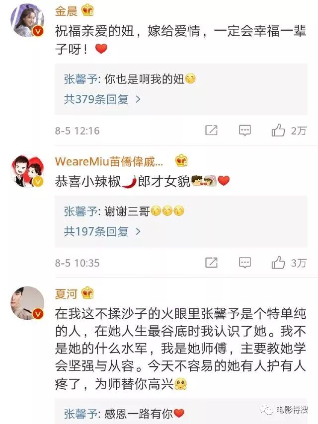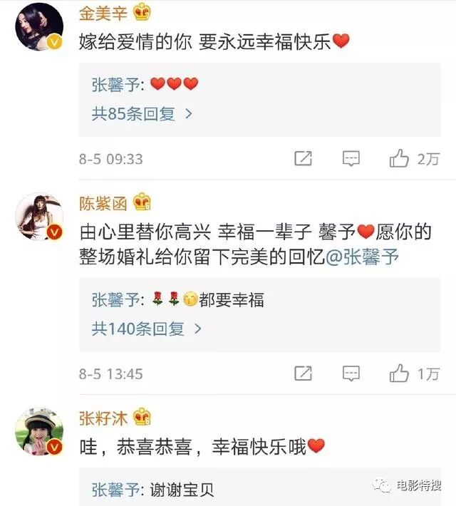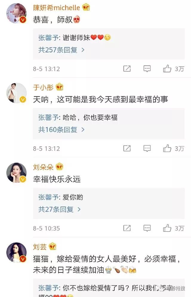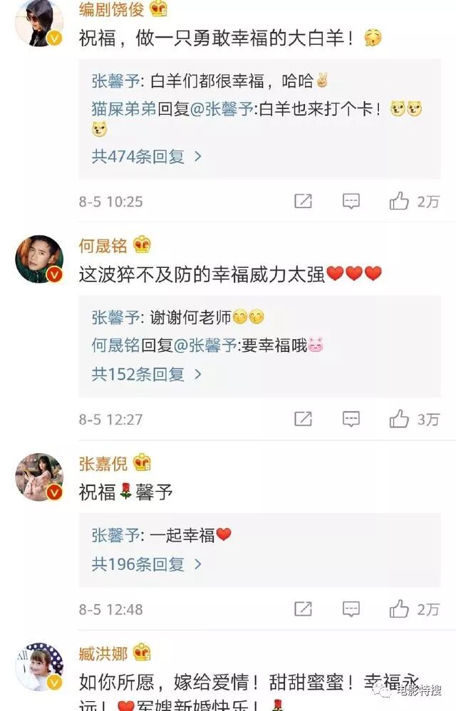这个喜讯一传开,除了网友纷纷送上祝福,大半个娱乐圈的明星都纷纷转发祝福沾喜气,而且张馨予每个人的祝福都亲自回复致谢,礼数也非常周到。张馨予宣布婚讯炸出豪华朋友圈,下面的明星祝福可以看出张馨予的朋友圈有多豪华。