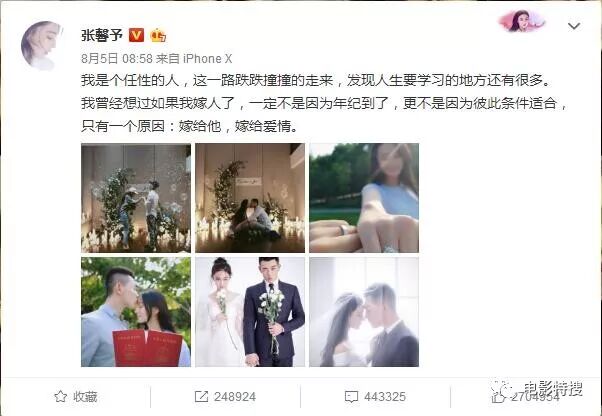 张馨予果然是个任性的姑娘啊,略过宣布恋情,直接晒出结婚证和婚纱照宣布结婚。