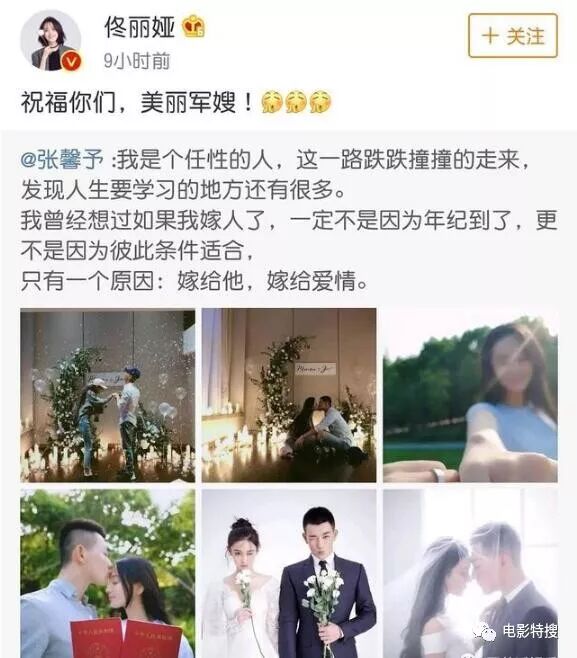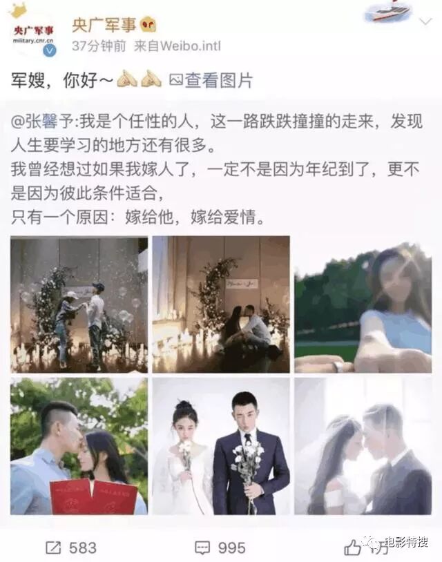 婚讯一传开,这些明星们集体现身,才让人发觉,原来张馨予在娱乐圈的人缘真的不错啊!最后让人激动的是咱们央广军事官方微博也转发了张馨予的微博,配文说:“军嫂,你好!”我的天,这个祝福太大了,张馨予结婚连央广军事都送来了祝福。