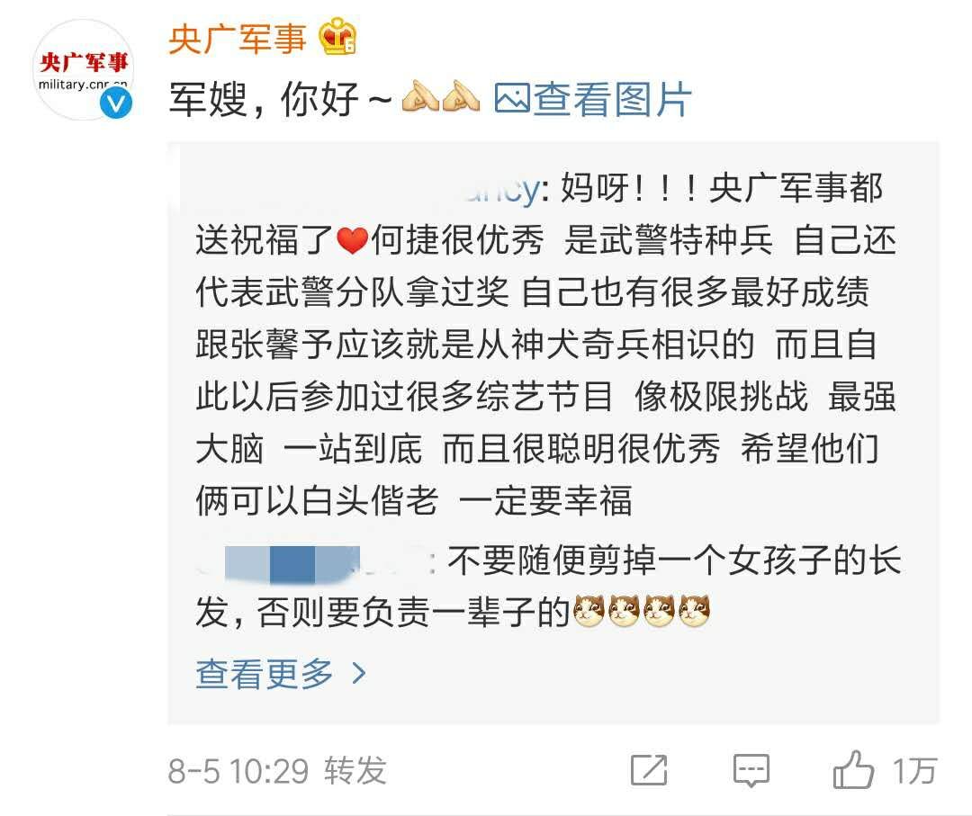 如今和张馨予结婚,也算完成了另一件人生大事吧。连央广军事都送上了祝福,何捷真的很优秀了。