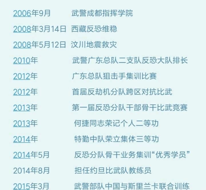 何捷并不只是普通军人,他多次参加特战技能比武,夺得多个项目第一,屡次参加武警部队与外国军警部队反恐骨干训练。带头研究反劫机战法,深入反恐,完成“雷霆扫毒任务“,是一位优秀的武警特种兵。