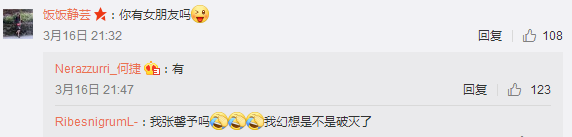 其实很早就有人怀疑他俩是不是有情况,今年3月份,有网友在何捷的微博里留言“你有女朋友吗?”他回复:“有”